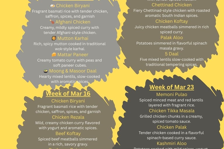 Each week includes a curated menu of 5 flavorful dishes — a mix of biryani or rice, meat curries, vegetarian options, and lentils.